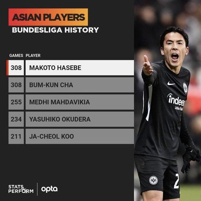 또 한국 축구의 전설 차범근의 기록을 넘었다. 하세베는 지난 2019-2020시즌 차범근의 308경기를 넘어 아시아 선수 분데스리가 최다 출전 기록을 세웠다. 분데스리가의 레전드가 됐다. 심지어 2024년까지도 분데스리가에서 활약했을 정도로 자기 관리를 상당히 잘했다.