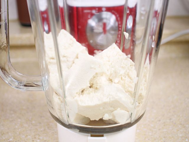 믹서기에 두부 1모를 넣어요.