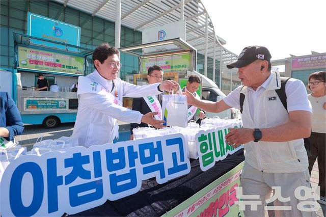 이상일 용인특례시장은 11일 아침 '용인백옥쌀 아침밥 먹기 캠페인'에 참여해 시민들에게 아침밥을 나눠주고 있다./사진=용인시