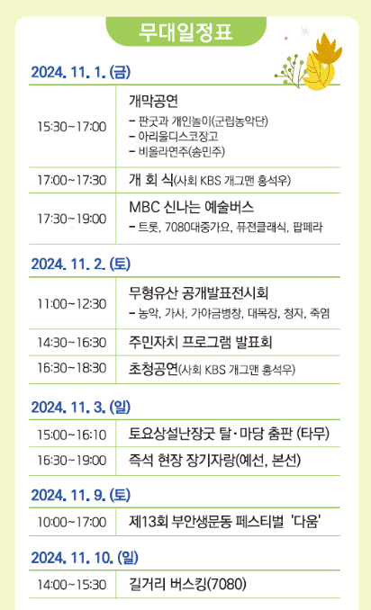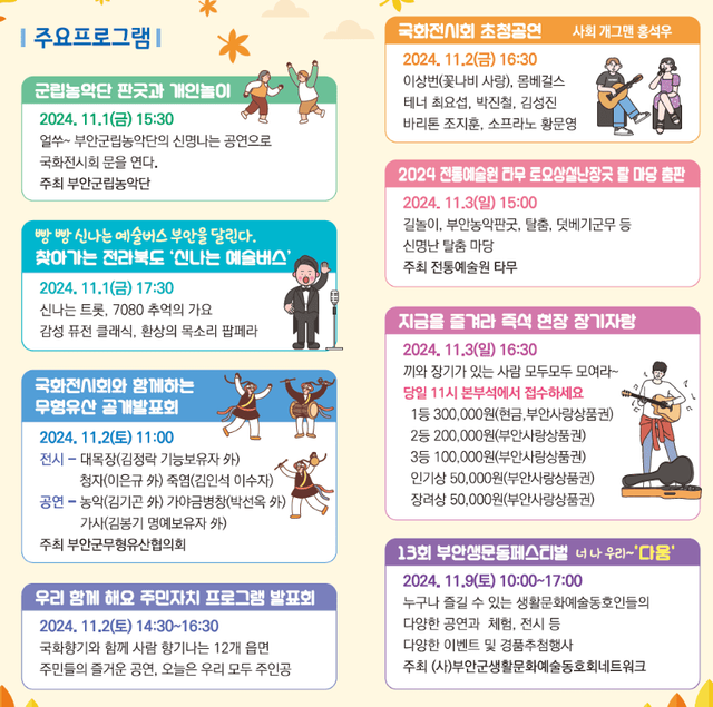 - 내용: 부안의 12개 읍면 주민들이 함께하는 즐거운 공연을 통해 지역사회의 화합을 느낄 수 있습니다.
