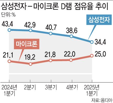 마이크론은 세계 최대 메모리업체로 명성을 떨치던 삼성전자의 점유율을 사실상 그대로 가져왔다. 삼성전자의 D램 점유율은 2023년 4분기 45%를 정점으로 1년 넘게 하락세를 보이고 있다. 지난해 1분기 43.4%를 기록한 이후 그해 2분기 42.9%, 3분기 40.7%, 4분기 38.6%를 각각 보였다. 올해 1분기에는 34.4%로 더 떨어지며 SK하이닉스에 D램 1위 자리를 내줬다. 올해 1분기 마이크론과의 점유율 격차는 9.4%포인트다. 20%포인트 넘던 점유율 차이가 불과 1년새 10%포인트 안으로 좁혀졌다.