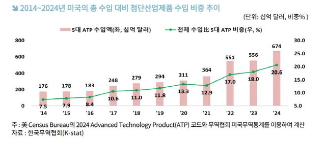 같은 기간 내 미국 ATP 수입시장에서 아세안(+9.5%P), 대만(+7.9%P), 유럽연합(+7.0%P) 등이 비중을 확대하며 중국의 빈자리를 빠르게 대체했다. 이는 트럼프 1기 이후 미국의 중국산 반도체 견제가 이어지면서 반도체 제조공장이 밀집한 아세안과 대만으로 수입선이 일부 대체되고 코로나19 이후 유럽연합(EU)으로부터 의약품 수입이 확대된 결과 등으로 풀이된다. 우리나라의 경우 같은 기간 ATP 수입시장 점유율이 1.7%P 증가한 4.0%에 그쳤는데 이는 점유율이 9.4%를 차지하는 전자를 제외한 다른 4개 부문이 낮기 때문이다.