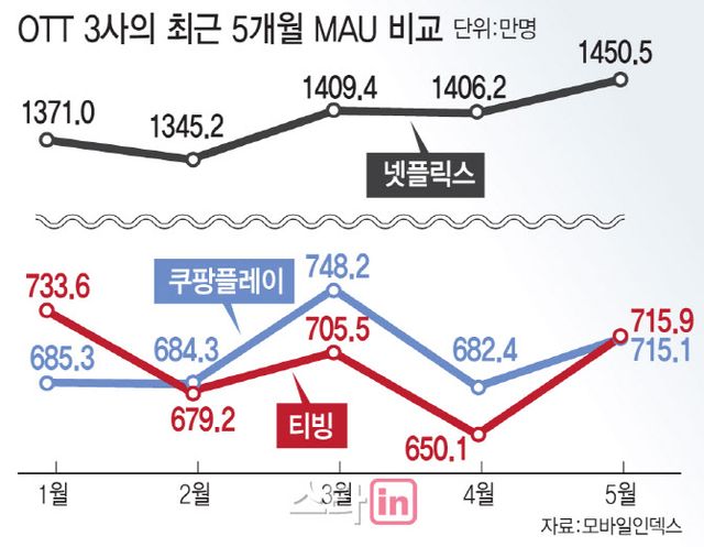 11일 빅데이터 플랫폼 아이지에이웍스 모바일인덱스에 따르면 5월 기준 티빙의 월간활성이용자 수(MAU)는 715만 8800명으로 전월대비 10% 증가한 것으로 집계됐다. 쿠팡플레이에 뺏겼던 2위 자리도 4개월 만에 탈환했다. 쿠팡플레이의 MAU는 715만 1036명으로, 티빙에 불과 7764명 모자랐다. 넷플릭스의 MAU가 1450만5305명으로 압도적인 가운데 티빙과 쿠팡플레이가 박빙의 승부를 펼치고 있다.