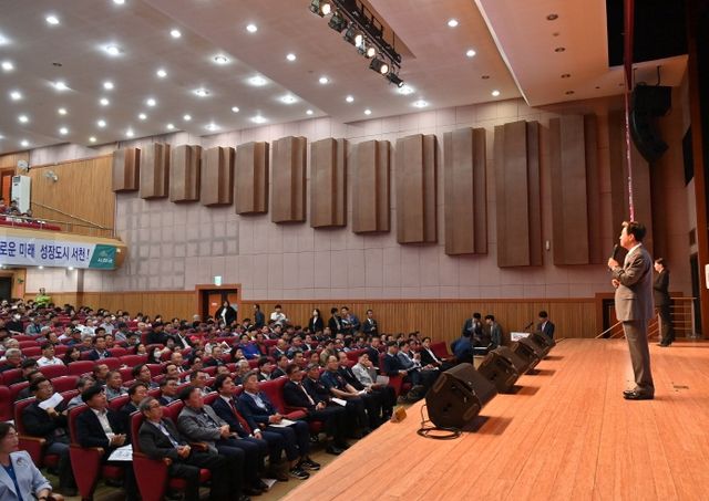 | ▲ 김태흠 충남도지사가 지난해 5월 13일 민선8기 3년차 시군 방문 첫 일정으로 서천군을 찾아 문예의 전당 대공연장에서 도민과의 대화를 진행하고 있다. |