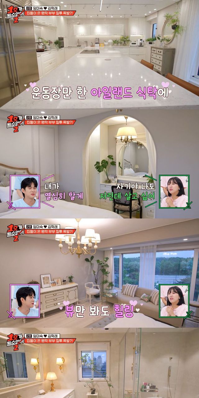 김학래, 임미숙이 이사한 집은 잠실 L타워가 보이는 100평 아파트였다. 최설아는 "우리 집 네 배"라며 감탄했고, 임라라는 "자기야 나도 저런 데 살고 싶어"라며 부러워했다. "호텔이야?", "LA 저택 같다"는 반응도 쏟아졌다.