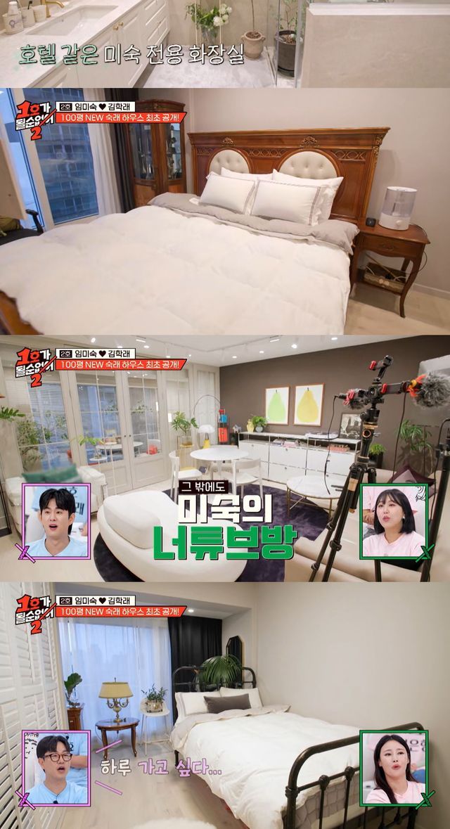 100평인 만큼 넓은 거실과 탁 트인 부엌 인테리어가 눈길을 끌었다. 임미숙이 홀로 사용하는 방, 드레스룸, 화장실은 물론 임미숙 유튜브 방, 게스트룸도 존재했다. 우드톤으로 꾸며진 김학래 방도 눈길을 끌었다.