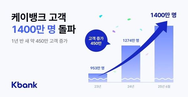 뉴시스 보도에 따르면, 케이뱅크에 따르면 지난 2023년 말(953만명)과 비교해 1년 6개월여 만에 약 450만명의 신규 고객을 유치했다. 올해 들어서는 매월 25만명 이상이 새롭게 가입하며 5개월 만에 126만명 증가했다.
