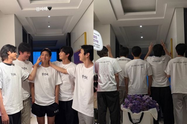 공개된 사진 속에는 우가팸 멤버로 알려진 박서준, 최우식, 박형식, 픽보이와 전역 축하 파티를 하고 있는 뷔의 모습이 담겼다. '환영해'라고 적힌 하얀 반팔 티셔츠를 맞춰 입은 우가팸은 군 복무를 무사히 마친 뷔를 쓰다듬으며 애정을 드러내고 있다.