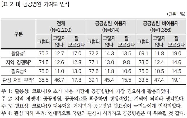 한국보건산업진흥원 바이오헬스정책연구센터가 최근 발간한 ‘공공병원 기여도 인식과 이용 상충 원인 분석’ 보고서에 의하면 공공병원 역할과 기여도에 대한 인식 조사 결과 성인 남여 2200명을 대상으로 질문한 결과 응답자의 70%이상이 공공병원 기여도에 긍정적이라고 답했다. 또한 10명 중 8명 이상이 공공병원이 필요하다고 인식하고 있었다. 이들은 공공병원이 코로나19 초기 대응에 긴요하게 활용됐으며, 지역 경쟁력 강화에 기여할 수 있고 지역에 꼭 필요하다고 평가했다.