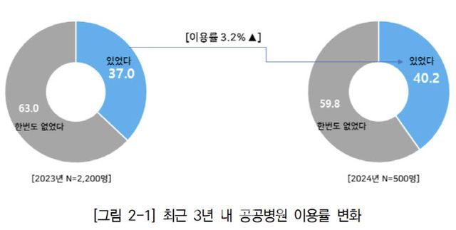 반면 공공병원 이용률은 공공병원 기여도를 긍정적으로 바라본 이용자 중 절반 수준이었다. 2023년 기준 응답자의 37%만이 공공병원을 이용했으며, 2024년에는 40.2%에 불과했다. 다만 일반질환의 경우 민간병원만 이용하는 비율이 43,2%로 높았으나, 중증질환은 민간병원만 이용하는 비율이 6.4%, 공공병원과 민간병원 모두 이용한 비율이 6.8%로 엇비슷하게 나타났다.