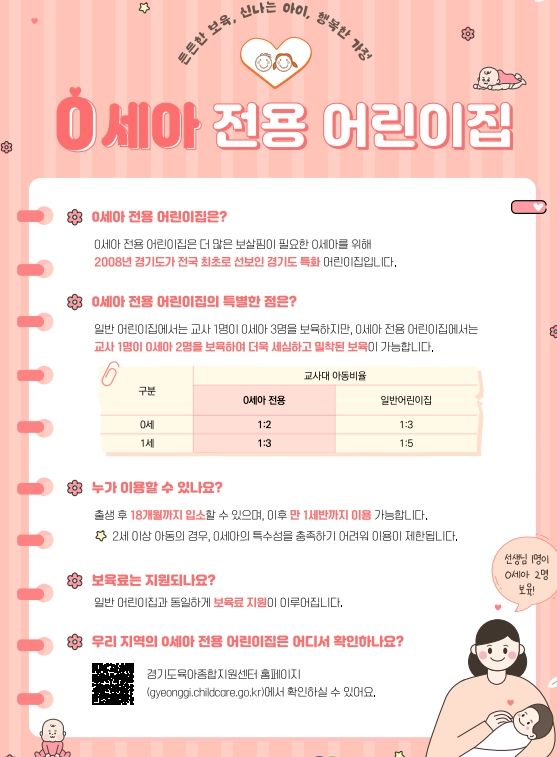 2008년 경기도에서 전국 최초로 선보인 ‘0세아 전용 어린이집’은 교사 대 영아의 비율을 1대2(0세반) 또는 1대3(1세반)으로 축소하여 운영하는 어린이집으로 0세아 보육의 특수성에 맞춘 맞춤형 밀착보육 서비스를 제공하고 있다.