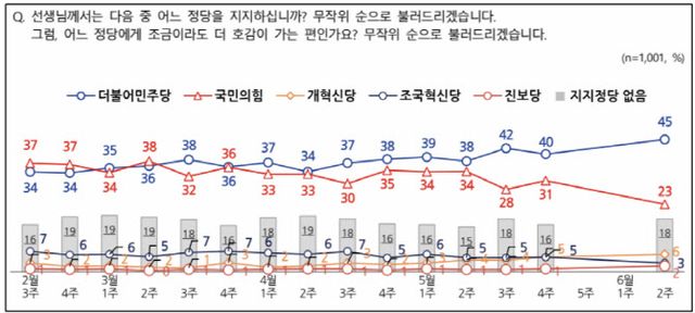 엠브레인퍼블릭·케이스탯리서치·코리아리서치·한국리서치가 지난 9일부터 전날까지 만 18세 이상 남녀 1천1명을 대상으로 진행한 전국지표조사(NBS) 결과에 따르면, 정당 지지도는 민주당이 45%를 기록해 23%를 기록한 국민의힘을 크게 앞질렀다. 대선 전이었던 3주 전(5월 4주차)과 비교해, 민주당은 5%포인트 높아진 반면, 국민의힘은 8%포인트가 내려간 수치다. 두 정당에 이어 △개혁신당 6% △조국혁신당 3% △진보당 2% 등이 뒤를 이었다.
