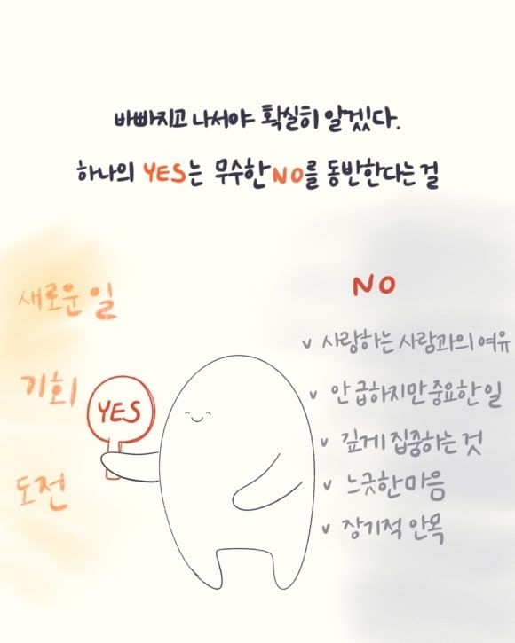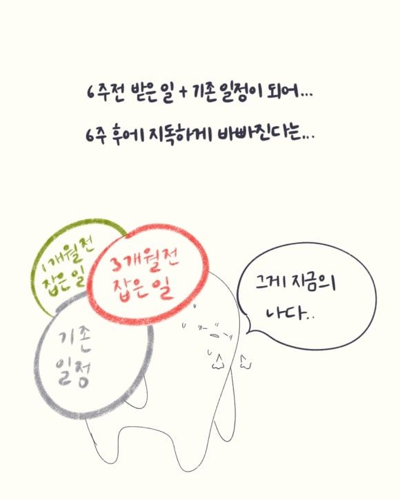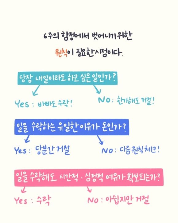 무수히 많은 번아웃을 겪으며 배운 교훈 중 하나는 “번아웃은 해소하는 것보다 예방하는 게 더 낫다”는 점. 그러기 위해서는 지쳐 쓰러지기 전에 미리 일을 줄이고 포기하는 과정이 필요하다. 여기서 중요 포인트는, 조금 살만한 시점/살짝 바쁘다 하는 시점부터 일을 줄여야 6주 후에 다시 한가해진다는 점!