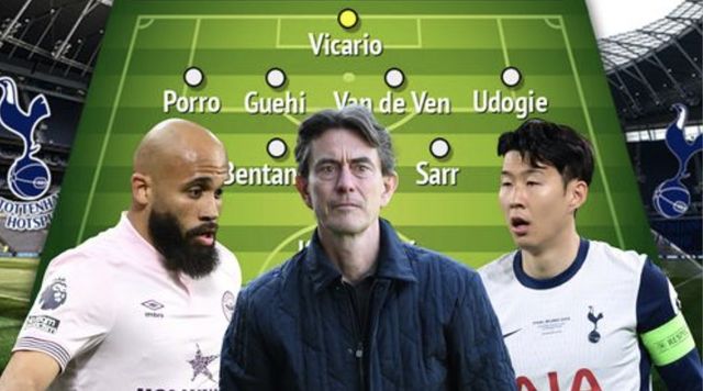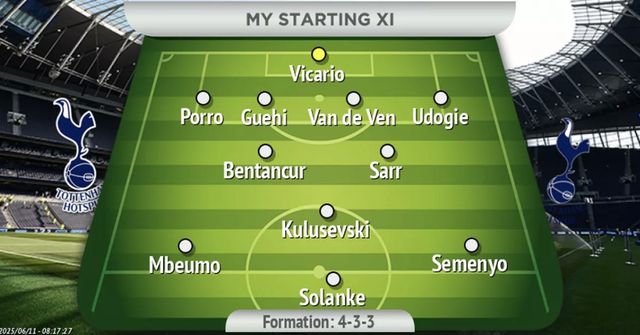 매체는 4-3-3 포메이션을 기반으로 예측했다. 먼저 비카리오가 골문을 지켰다. 페드로 포로, 게히, 미키 판 더 펜, 데스티니 우도기가 수비진을 구성했다. 모르텐 히울만, 루카스 베리발, 에체베리 에제가 중원으로 나섰다. 그리고 음뵈모, 솔란케, 손흥민이 공격진으로 나설 것으로 전망했다.