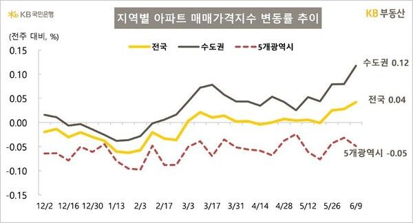 전국 아파트 매매가격은 5월 중순까지만 해도 보합권이었으나 5월19일 0.00%→5월26일 0.03%→6월2일 0.03%→6월9일 0.04%로 상승률이 점차 높아지는 추세다.