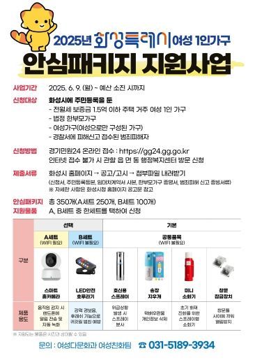 [와이뉴스] 화성특례시는 여성1인가구, 법정 한부모가구, 범죄피해 여성 등을 대상으로 ‘2025년 여성1인가구 안심패키지 지원 사업’을 추진한다.