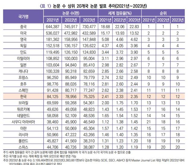 한국과학기술기획평가원(KISTEP)이 9일 발표한 2023년 한국의 과학기술논문 발표 및 피인용 현황 브리프에 따르면, 2023년 한 해 동안 한국이 발표한 과학기술 논문은 총 75,325건으로, 전 세계 논문 발표 순위에서 3년 연속 12위를 기록했다. 논문 점유율은 2017년부터 2.30% 전후로 유지했다. 미국(12.5%→17.4%), 영국(41.7%→50.9%), 일본(64.4% → 88.2%) 등 세계 10위권 국가와 비교하면 상대적 점유율이 상승하고 있는 수준이다.