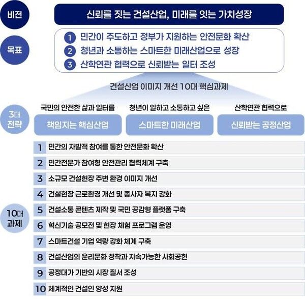 건설동행위는 ‘신뢰를 짓는 건설 산업, 미래를 잇는 가치 성장’을 비전으로, 3대 목표 10대 과제가 담긴 로드맵을 마련했다. 3대 목표는 ▲민간이 주도하고 정부가 지원하는 안전 문화 확산 ▲청년과 소통하는 스마트한 미래 산업으로 성장 ▲산·학·연·관 협력으로 신뢰받는 일터 조성 등이다.