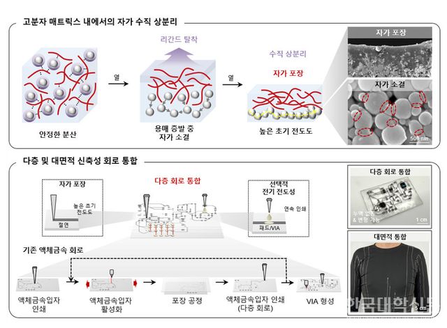 연구팀은 고온 조건에서 NMP(N-Methyl-2-pyrrolidone) 용매에 초음파를 가해 분자 구조를 열어주는 반응을 유도했다. 이 과정으로 만들어진 아민계(amine) 리간드가 액체금속입자 표면에 달라붙어, 입자가 쉽게 산화되지 않도록 막아주고 잘 퍼지게 도와준다. 인쇄 공정 후에는 용매가 자연스럽게 증발하면서, 리간드는 입자 표면에서 떨어져 나가고 입자들끼리 스스로 달라붙어 전기가 잘 통하는 통로를 형성한다. 이와 동시에 입자들이 하부로 가라앉고 고분자는 상부에 형성돼, 별도의 공정 없이도 전도층과 절연 포장층이 동시에 구현돼 위 아래로 상이 분리되는 수직 상분리 구조가 완성된다. 즉, 복잡한 과정 없이 한 번의 인쇄로 전도성과 절연 기능을 동시에 갖춘 회로가 완성되는 것이다.