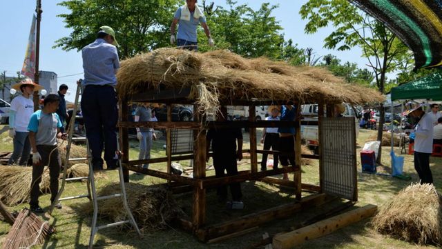 2015년 열린 '제16회 음성품바축제'의 품바 움막 짓기 대회에 참가한 주민들 모습. / 연합뉴스