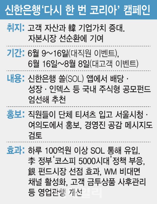 신한은행은 이번 캠페인에 수수료 이익 등 비이자 이익을 늘리는 것 이상의 의미를 두고 있다. 현대증권·KB증권 등 증권사가 이끌었던 ‘국장 부흥’ 메시지를 은행에서 낸다는 점이다. 외환위기 직후인 1999년 현대증권은 당시 이익치 회장이 “저평가된 한국을 사라”는 슬로건을 내걸고 바이 코리아 캠페인을 펼쳤다. 출시 3개월 만에 국내 주식형 펀드에 12조원을 끌어모아 증권사 순위에 지각변동을 일으켰다. 당시 국내 주식시장 활성화 정도를 고려할 때 IMF 외환위기 금 모으기 운동에 비견될 정도로 선풍적이었다.