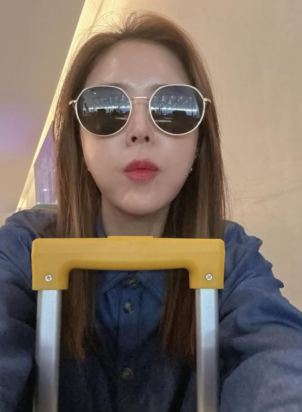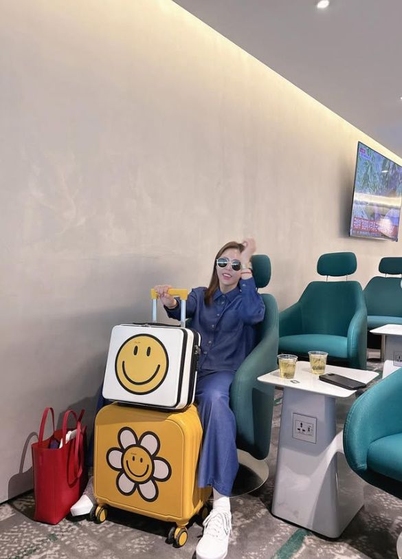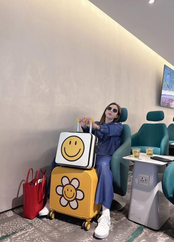 그녀는 진청 컬러의 셋업 의상에 흰 운동화, 동그란 선글라스를 매치하며 편안하면서도 세련된 공항패션을 선보였다. 특히 노란 손잡이와 해바라기, 스마일 패턴이 돋보이는 캐리어가 발랄한 매력을 더했다.