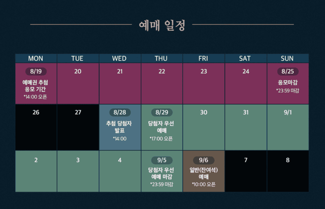 행사는 2024년 9월 12일부터 11월 10일까지 매일 저녁 7시에 시작되며, 100분가량 소요됩니다. 회차별로 다른 시간대에 나뉘어 진행되며, 참가 인원이 제한되어 사전 예약이 필수입니다. 티켓 예매는 내국인은 티켓링크, 외국인은 크리에이트립에서 가능합니다.