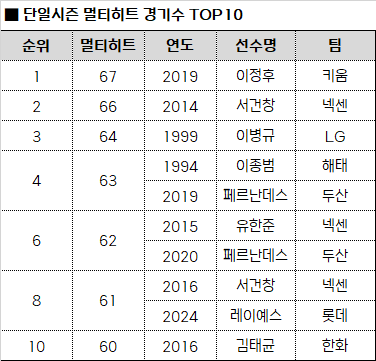 현재 페이스가 이어지면, 레이예스는 남은 시즌 35~36번 더 멀티히트를 해낼 수 있을 전망이다. 이 부분에서도 신기록 달성에 도전할 수 있다.KBO리그 역대 '단일시즌 최다 멀티히트'를 기록한 선수는 현재 메이저리그(MLB)에서 뛰고 있는 이정후(샌프란시스코 자이언츠)다. 그는 2019시즌 총 67번 2안타 이상 기록했다. 2위 기록은 KBO리그 최초로 200안타를 달성한 서건창이 그해(2014년) 해낸 66번이다. 1999년 65번 해낸 이병규(은퇴)가 3위, 1993년 이종범과 2019년 호세 페르난데스가 각각 63번으로 공동 4위에 올라 있다.