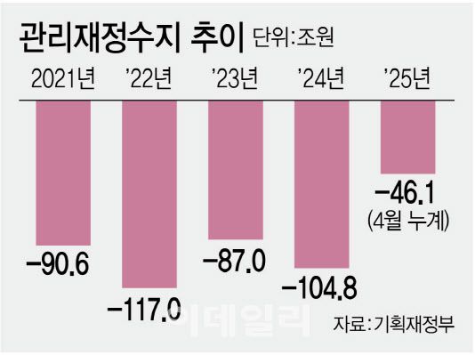 윤석열 정부의 감세 정책 등의 영향으로 재정 상황이 악화한데다 내수 침체 장기화와 트럼프발 통상 리스크까지 겹치면서 세(稅) 수입 전망도 좋지 않자, 새는 지출을 틀어 막겠단 것이다. 이날 기재부가 발표한 ‘월간 재정동향(6월호)’에 따르면 지난 4월까지 나라살림 지표인 관리재정수지는 46조 1000억원의 적자를 기록했다. 전년동기대비 18조 5000억원 줄었지만, 4월 누계 기준 2020년(56조 6000억원), 2024년(64조 6000억원)에 이어 역대 세 번째로 큰 규모다.