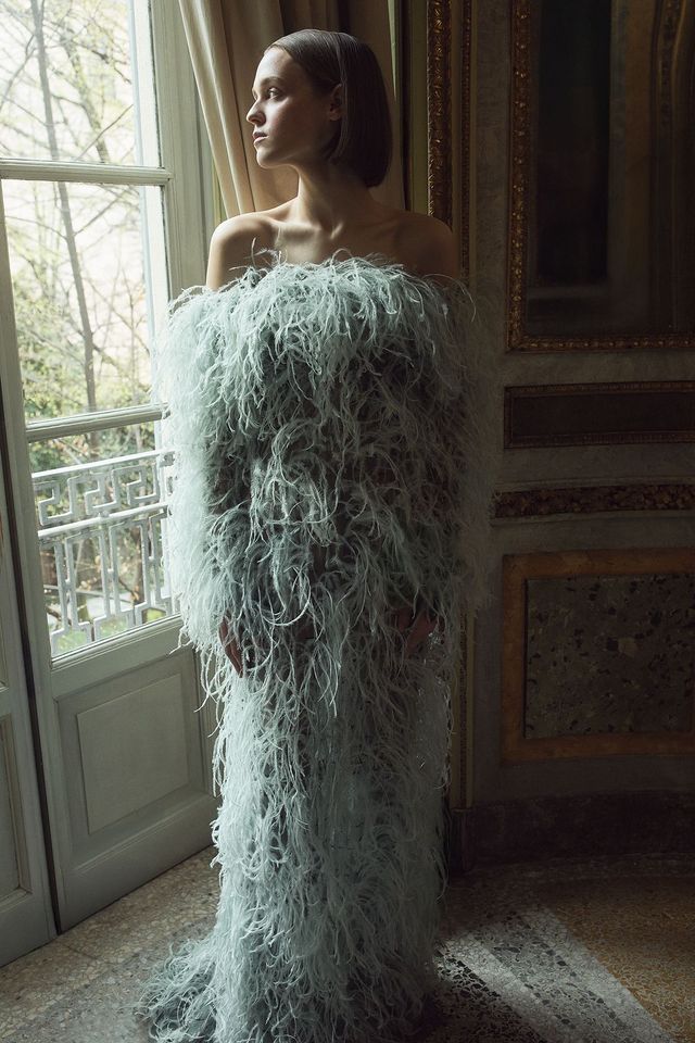 크리스털과 페더 장식 드레스는 2023 F/W 컬렉션 Giorgio Armani Privé.
