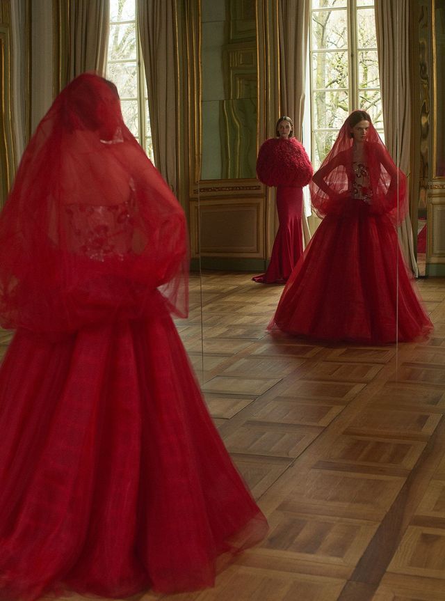 크리놀린, 오간자 소재의 볼레로, 실크 크레이프 드레스는 2014 F/W 컬렉션, 시퀸·스팽글 장식 드레스, 오간자 베일은 2023 F/W 컬렉션 모두 Giorgio Armani Privé.