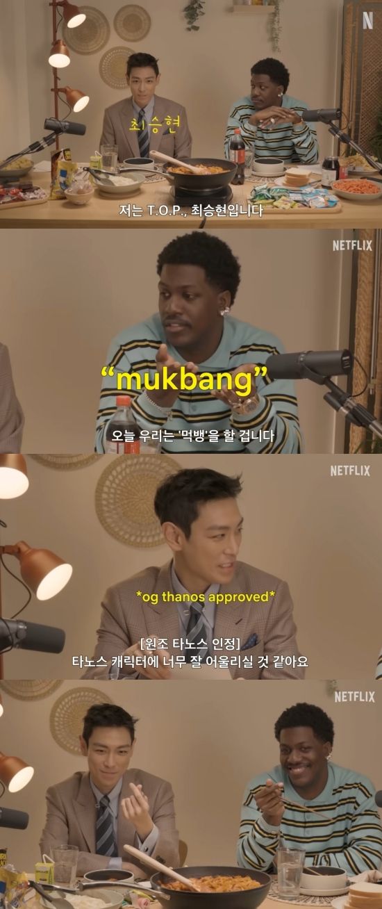 영상 속 탑은 "안녕하세요 넷플릭스, 제 이름은 T.O.P., 최승현입니다"라고 영어로 자기소개했다. 이어 릴 야티는 "오늘 우리는 '먹뱅'을 할 거다"라고 소개했고, 탑은 '먹방'이라고 정정하며 먹방 및 토크를 이어 갔다.