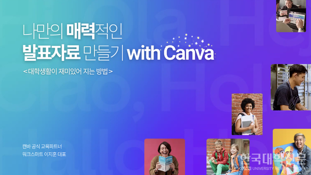 워크숍은 △나만의 매력적인 발표 자료 만들기(with Canva) △나만의 매력적인 SNS 학습 콘텐츠 만들기(with Canva)라는 주제로 2회에 걸쳐 운영됐으며, ZOOM을 활용한 비대면 온라인 강의와 교내 실습 공간에서의 오프라인 활동을 병행하는 하이브리드 방식으로 진행돼 학생들의 접근성과 참여도를 높였다.