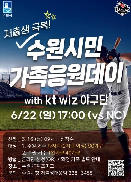 kt위즈와 함께하는 가족응원데이에는 수원에 거주하는 2자녀 이상 90가구와 1인 가구 40가구를 초청해 6월 22일 오후 5시에 열리는 kt위즈와 NC다이노스의 경기 관람 기회를 제공한다.