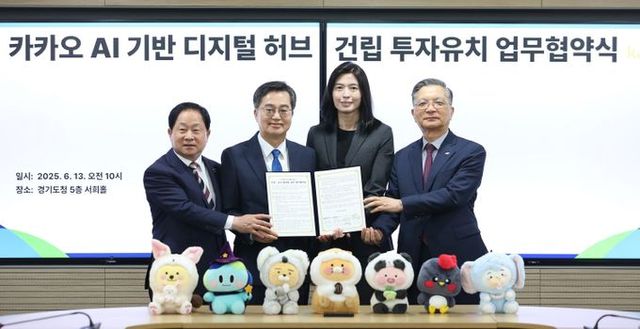 김동연 경기도지사는 13일 경기도청에서 정신아 ㈜카카오 대표, 주광덕 남양주시장, 이한준 한국토지주택공사(LH) 사장과 이런 내용을 담은 ‘AI 기반 디지털 허브 건립 투자협약’을 체결했다.