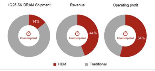 13일 글로벌 시장조사업체 카운터포인트리서치가 공개한 ‘2025년 1분기 메모리 보고서‘에 따르면 SK하이닉스의 전체 D램 영업이익 중 HBM 비중은 54%를 차지했다. D램 매출 가운데 HBM의 기여도는 44%였다.