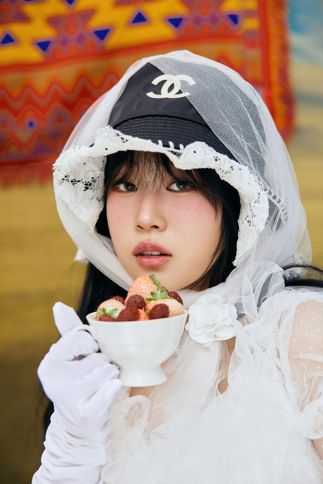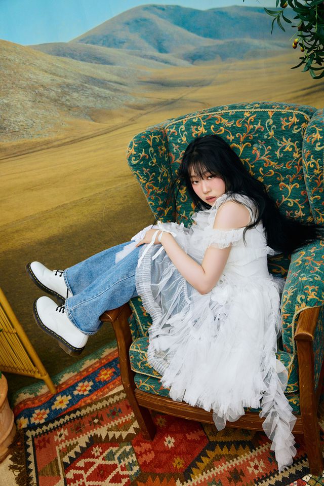 마지막 콘셉트 포토에서는 레트로풍 상의와 레이스 장갑, 양 갈래 리본 헤어스타일을 통해 강렬한 시각적 임팩트를 선사했다. 깊은 눈빛과 화려한 스타일링이 어우러져 니나의 예술적인 감각과 당당한 매력를 강조하며, 유니크한 캐릭터성을 한층 부각시켰다.