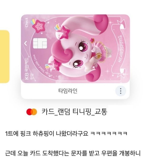 틴업체크카드 캐릭터 디자인은 하츄핑·오로라핑·빛나핑·초롱핑·반짝핑·왕자핑 등 6개 캐릭터가 랜덤하게 발급되는데, 작성자가 원하는 디자인은 하츄핑이었다.