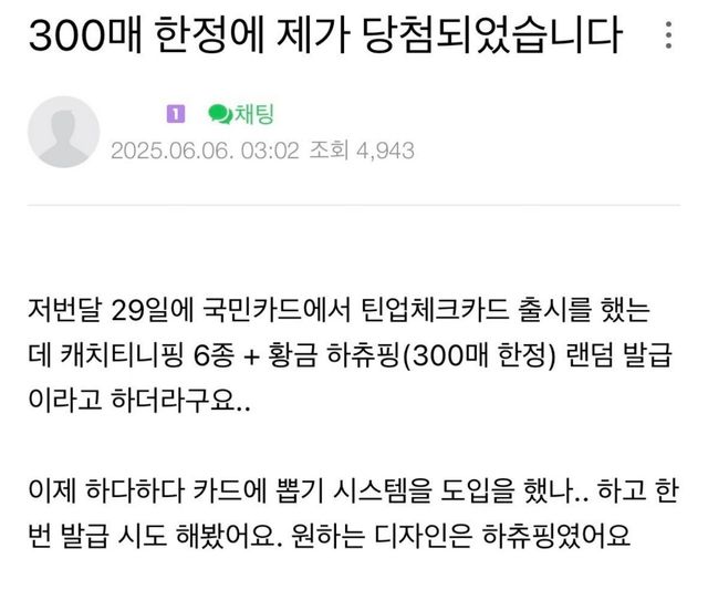 작성자는 “지난달 29일에 국민카드에서 ‘틴업체크카드’를 출시했다는 소식을 들었다”며 ”하다 하다 카드에 뽑기 시스템을 도입했나 하는 생각이 들었지만 한 번 발급을 시도해 봤다“고 운을 뗐다.