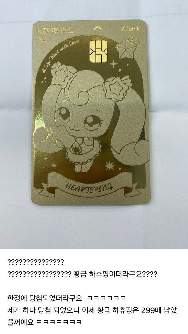 게시글에 함께 첨부된 황금 하츄핑 카드 실물은 기본 하츄핑 카드와 디자인은 동일하지만 무광과 유광이 어우러진 황금색으로 칠해져 고급스러운 자태를 뽐냈다. 작성자는 “제가 하나 당첨되었으니 이제 황금 하츄핑은 299매 남았다”고 말하며 글을 마무리했다.