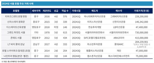 성급별로는 △5성급 1조1450억원 △4성급 4324억원 △3성급 2213억원으로 집계됐다. 티마크그랜드호텔 명동(2282억원), 신라스테이 광화문 등 4성급 이하 호텔들도 활발히 거래됐다.