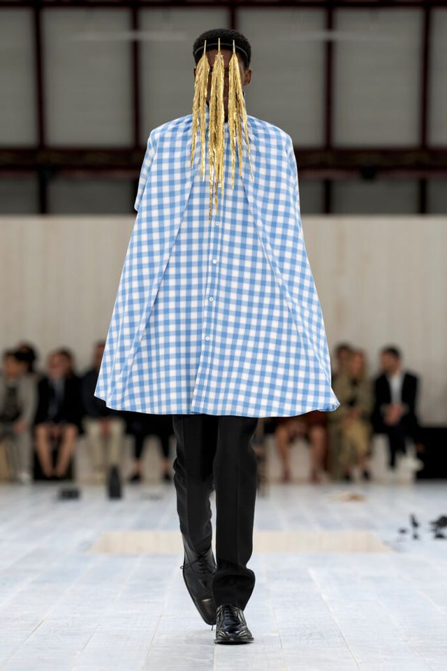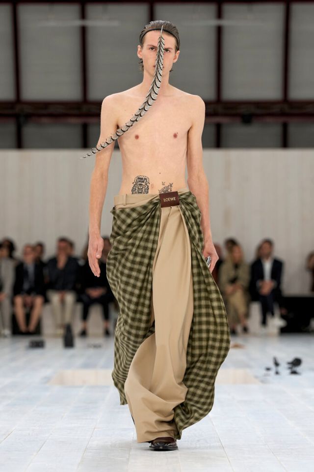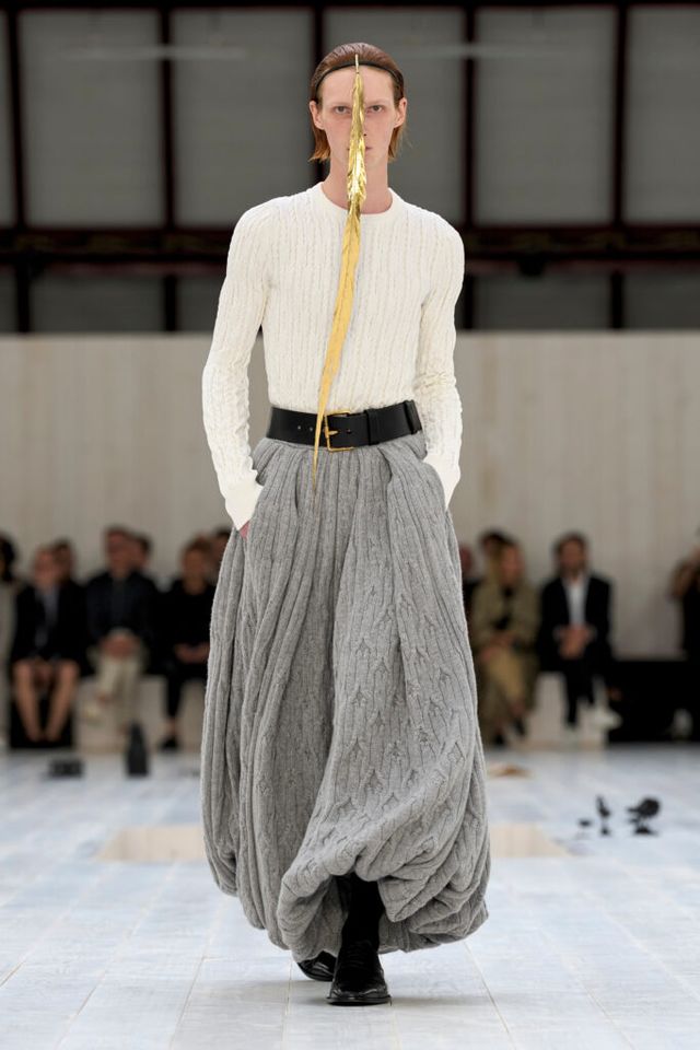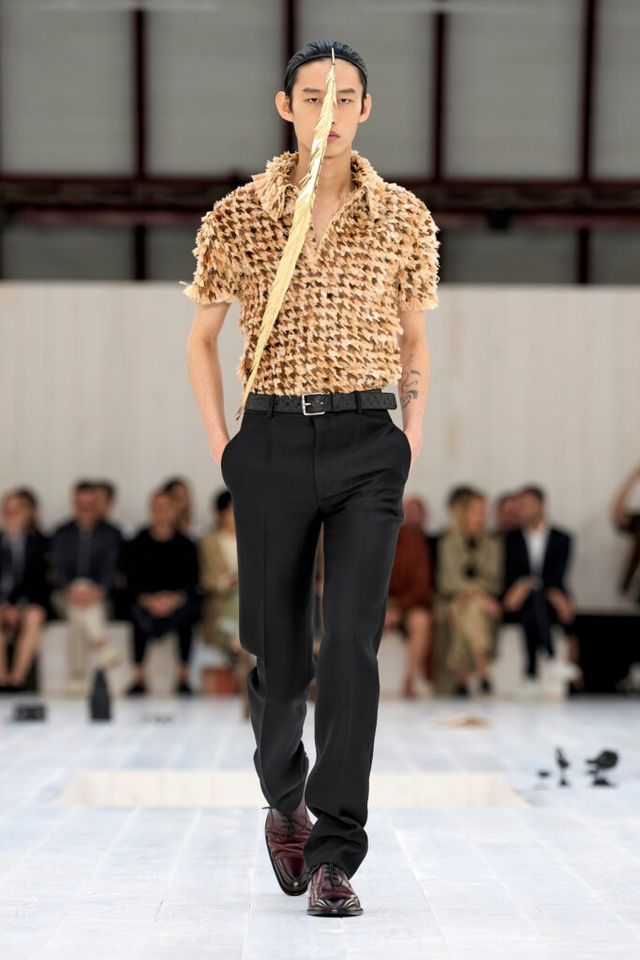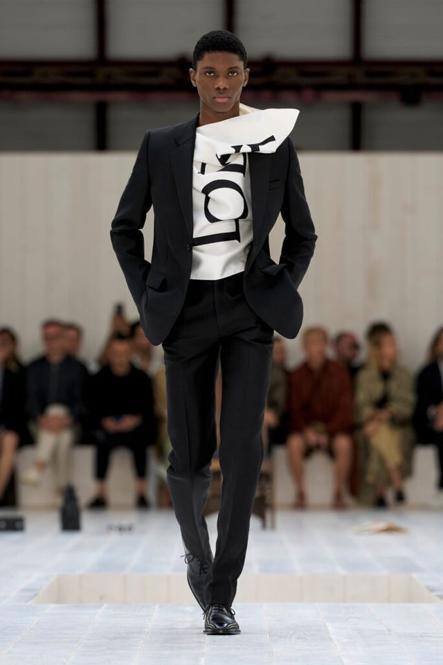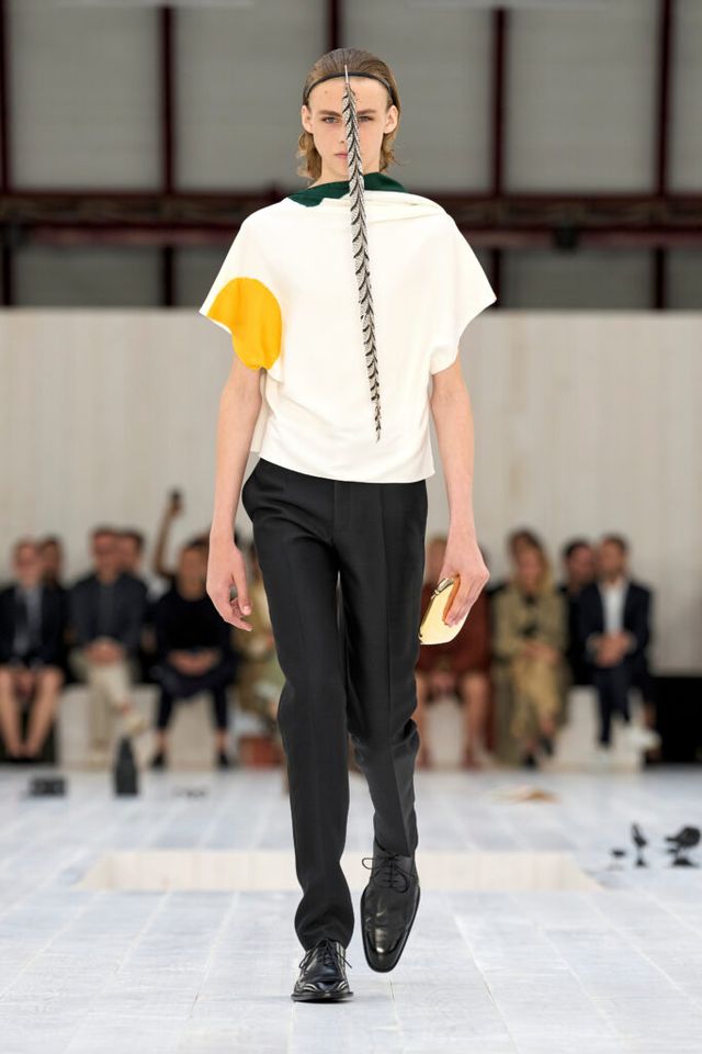 NOTE 얼굴에 깃털을 단 채 계단을 유유히 오르는 모델들을 통해 ‘급진적인 절제미’를 이야기한 조나단 앤더슨. 말 그대로 절제된 아름다움과 독창적 아이디어가 조화를 이룬 이번 컬렉션은 런웨이에 배치된 오브제들과 어우러져 독특한 분위기를 자아냈다. 절제미를 담은 블랙 테일러드수트와 커다란 로고, 반짝이는 소재, 드레이핑 디테일로 변주와 재미를 가미한 룩에서 초심으로 돌아간 듯한 조나단 앤더슨의 포부를 감지할 수 있었다.