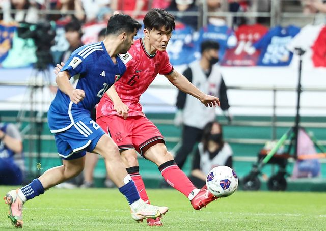 지난 10일 서울 마포구 상암동 서울월드컵경기장에서 열린 2026 국제축구연맹(FIFA) 북중미 월드컵 아시아 3차 예선 B조 10차전 대한민국과 쿠웨이트의 경기, 대한민국의 황인범이 슛을 시도하고 있다. / 뉴스1