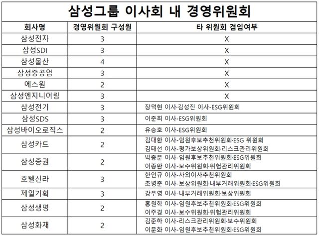 겸임하고 있는 비금융 계열사(삼성전기·삼성SDS·삼성바이오로직스)도 ESG위원회만 겸임하는 등 소극적인 겸임을 하고 있는 것으로 드러났다.