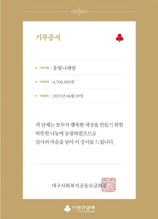 대구사회복지공동모금회(회장 신홍식)는 지난 6월 11일 대구 지역 팬클럽 '웅빛나래방'으로부터 기부금 470만 원을 전달받았다고 밝혔다.