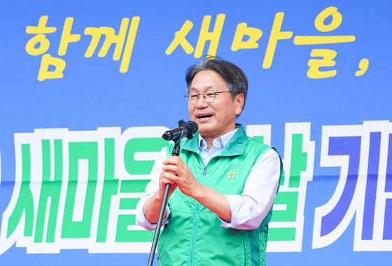 강기정 광주광역시장이 12일 오전 남구 효천물빛노닐터에서 열린 ‘제15회 새마을의 날 기념식’에 참석해 조인철 의원, 김병내 남구청장 등 내빈들과 퍼포먼스를 하고 있다.