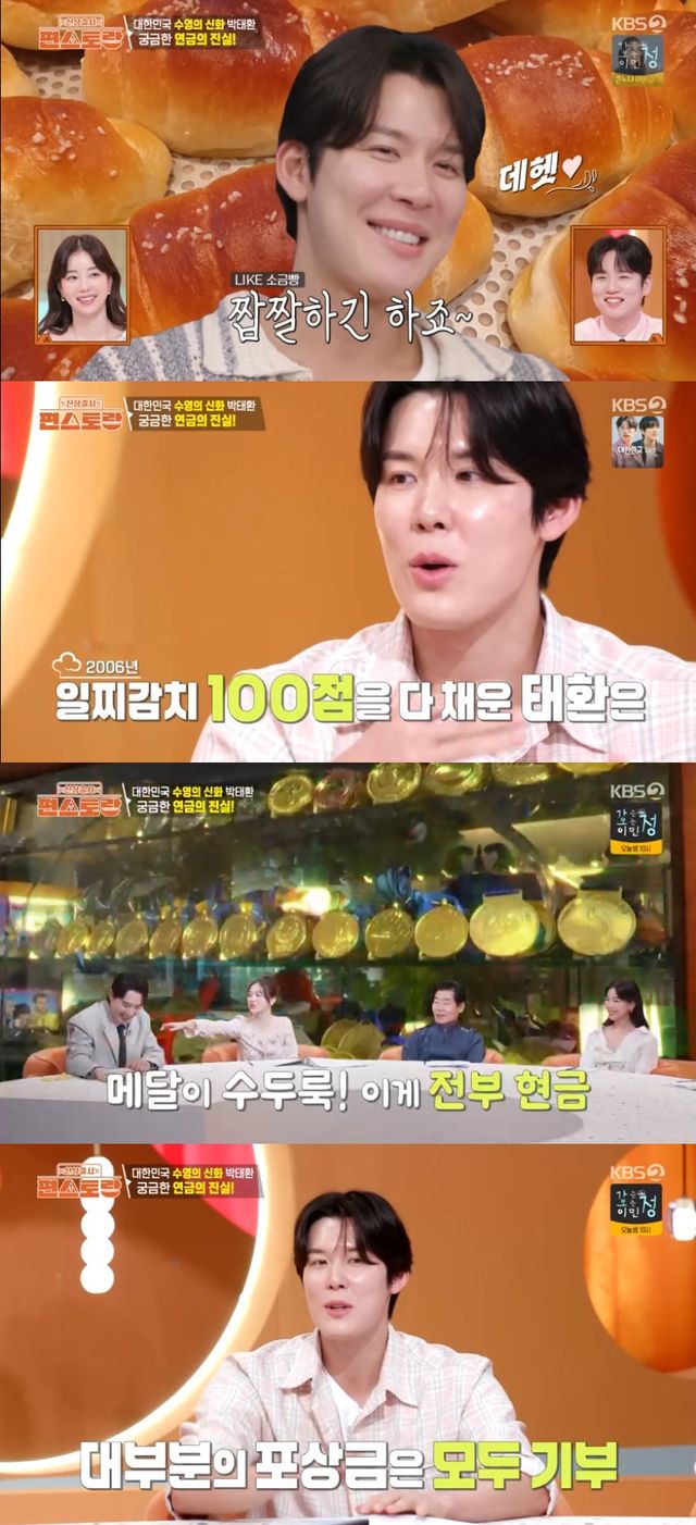 특히 박태환은 "100점 채우면 평생동안 연금이 나오는데 저는 점수가 차 있으니까, 그 다음부터 국제대회 나가서 딴 점수는 현금으로 일시불로 나온다. 포상금을 딸 때마다 받는다"라고 전했다.