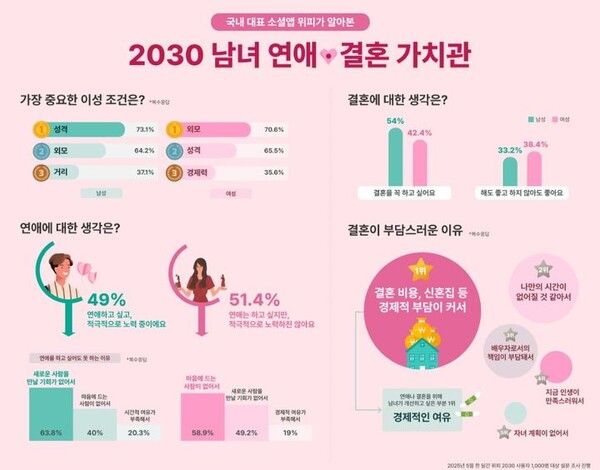 뉴시스 보도에 따르면, 소셜 디스커버리 서비스 '위피'를 운영하는 엔라이즈는 지난달 위피 사용자 1000명을 대상으로 실시한 '연애 결혼 가치관' 설문조사 결과를 12일 공개했다. 응답자 중 과반 이상이 25~34세(남성 65.2%, 여성 54.2%)였다.