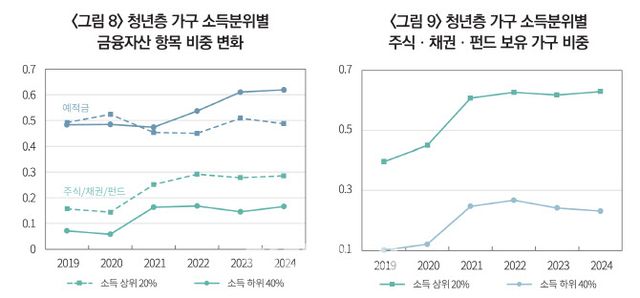 보고서에 따르면 소득에 따라 금융자산 투자 참여율과 성과는 큰 차이를 보이고 있다. 2019년 이후 소득 상위 20% 청년 가구의 금융자산은 꾸준히 증가한 반면, 하위 40% 가구의 금융자산은 오히려 감소했다. 2019년에는 고소득 청년 가구의 금융자산이 저소득 청년에 비해 3.7배 많았지만, 2024년에는 이 격차가 4.7배로 더 벌어졌다.