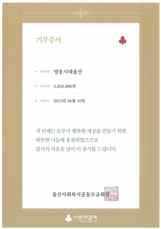 임영웅 팬클럽 '영웅시대 울산'은 6월 11일 울산사회복지공동모금회(회장 전영도)에 성금 385만 원을 전달했다고 밝혔다.